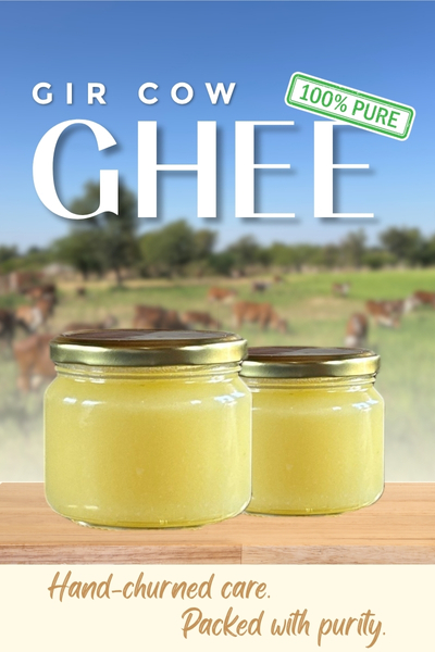 Our herd of over 60 Gir cows is the heart of Punamiya Farm. Raised on organic feed in a clean, peaceful environment, each cow is cared for with a personalised diet and regular health check-ups from Dr. Parexit Ji. Daily routines are managed by our trained caretakers and staff who ensure comfort, hygiene, and affection at every step. This ethical, stress-free environment naturally results in high-quality, nutrient-rich milk used to make our premium ghee
